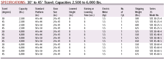 BENEFITS · Maintenance-free bearings, no greasing· Minimal platform deflection · Extended bearing life · Extended hose life for added safety · Polyethylene reservoir will not contain rust, weld slag or condensation apparent with metal tanks. Allows visual checking of oil level · Easy access to hydraulic/electrical components for servicing · Ready-to-operate lift with zero plumbing and minimal wiring POWER SUPPLY The electric motor is internally mounted. It is available in either 1 1/2 hp three-phase or 3/4 hp single-phase, with 24V AC control voltage.CUSTOM DESIGNS A number of "customized" engineering plans are already on file for the STE Series. Additionally, Autoquip offers computerized engineering services for development of "one-of-a-kind" ergonomic tilter applications.