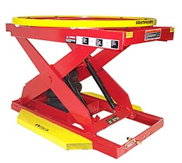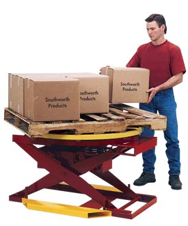 Virtually eliminate lifting, bending, and stretching, the primary causes of back injury. This simple, automatic unit is ideal for most applications. It incorporates a turntable to allow nearside loading and a system of springs and shock absorbers which lower and raise the unit as pallets are built up and broken down, to maintain a constant working height. No power or air supply is required. Pallet loads up to 4,500 lbs can be handled.